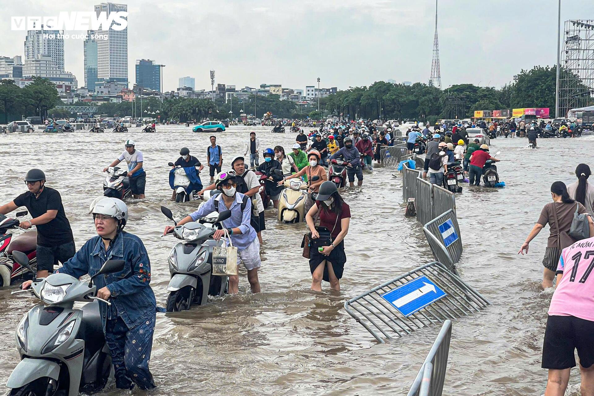 Dù mưa đã dứt, tại nhiều tuyến phố ở Thủ đô, người dân vẫn vất vả xách đồ, dắt xe, bì bõm lội nước ở nhiều khu vực ngập.