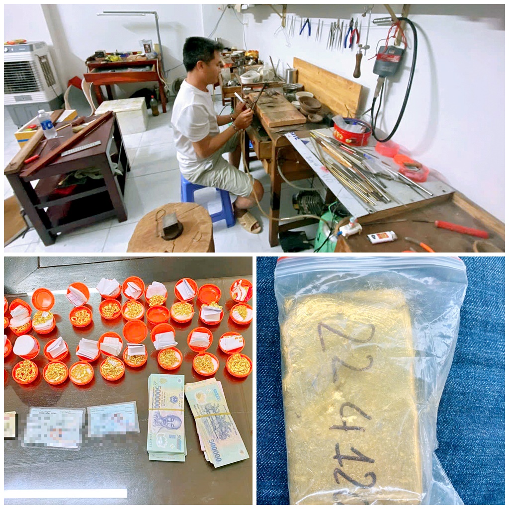 Khám xét khẩn cấp, Cơ quan Công an thu giữ 04 miếng vàng thô chưa chế tác, 22 sợi dây chuyền vàng có tổng trọng lượng 65 cây vàng trị giá gần 9 tỷ đồng và nhiều thiết bị máy móc để chế tác vàng giả.