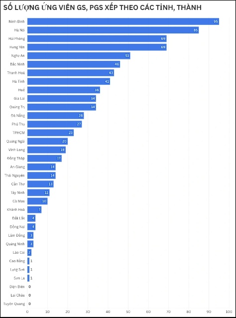 Theo thống kê của Hội đồng Giáo sư Nhà nước, Ninh Bình trở thành địa phương có nhiều ứng viên giáo sư, phó giáo sư đạt chuẩn nhất năm 2025 với 95 người, vượt qua cả Hà Nội và Hải Phòng. Đây là kết quả bất ngờ, cho thấy sự phát triển mạnh mẽ của đội ngũ trí thức, giảng viên có trình độ cao tại tỉnh.