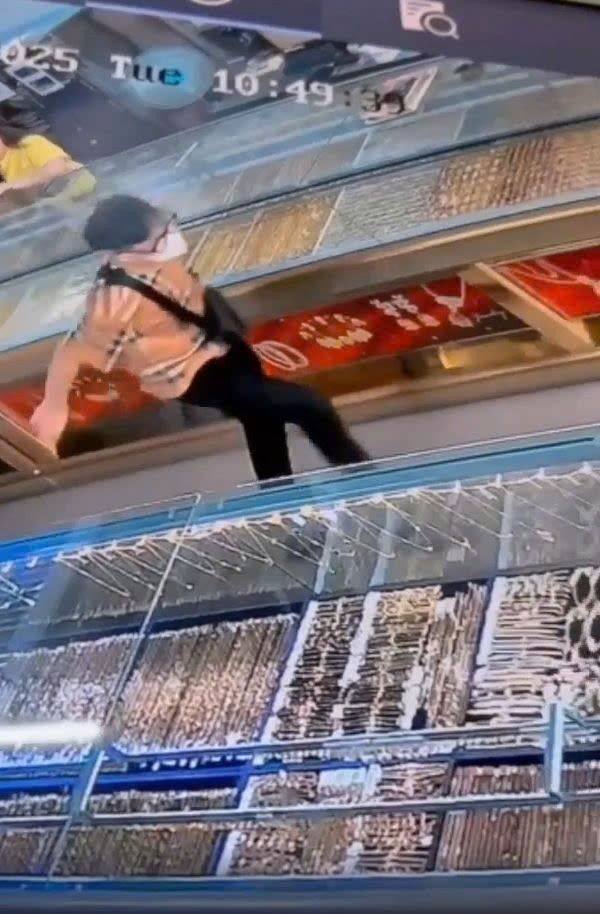 Sau khi cầm nhẫn vàng trên tay, đối tượng bỏ chạy ra ngoài và trèo lên xe máy của đồng phạm đang chờ sẵn để tẩu thoát.
