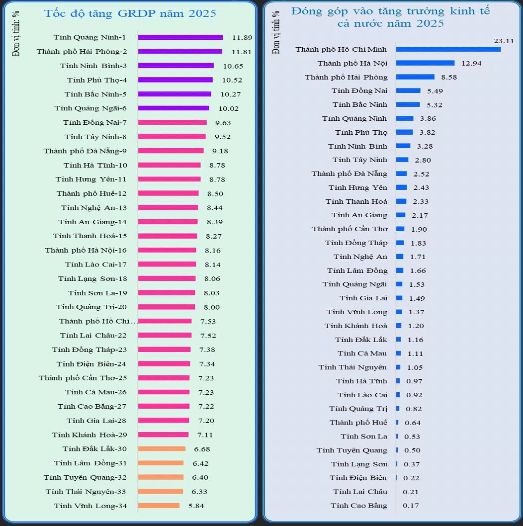 Năm 2025, Quảng Ninh dẫn đầu cả nước về tốc độ tăng trưởng GRDP – 11,89%, tiếp theo là Hải Phòng, Ninh Bình, đều tăng trưởng trên 10%, cao hơn đáng kể so với mức bình quân chung. 29/34 địa phương trên cả nước tăng trưởng trên 7%.