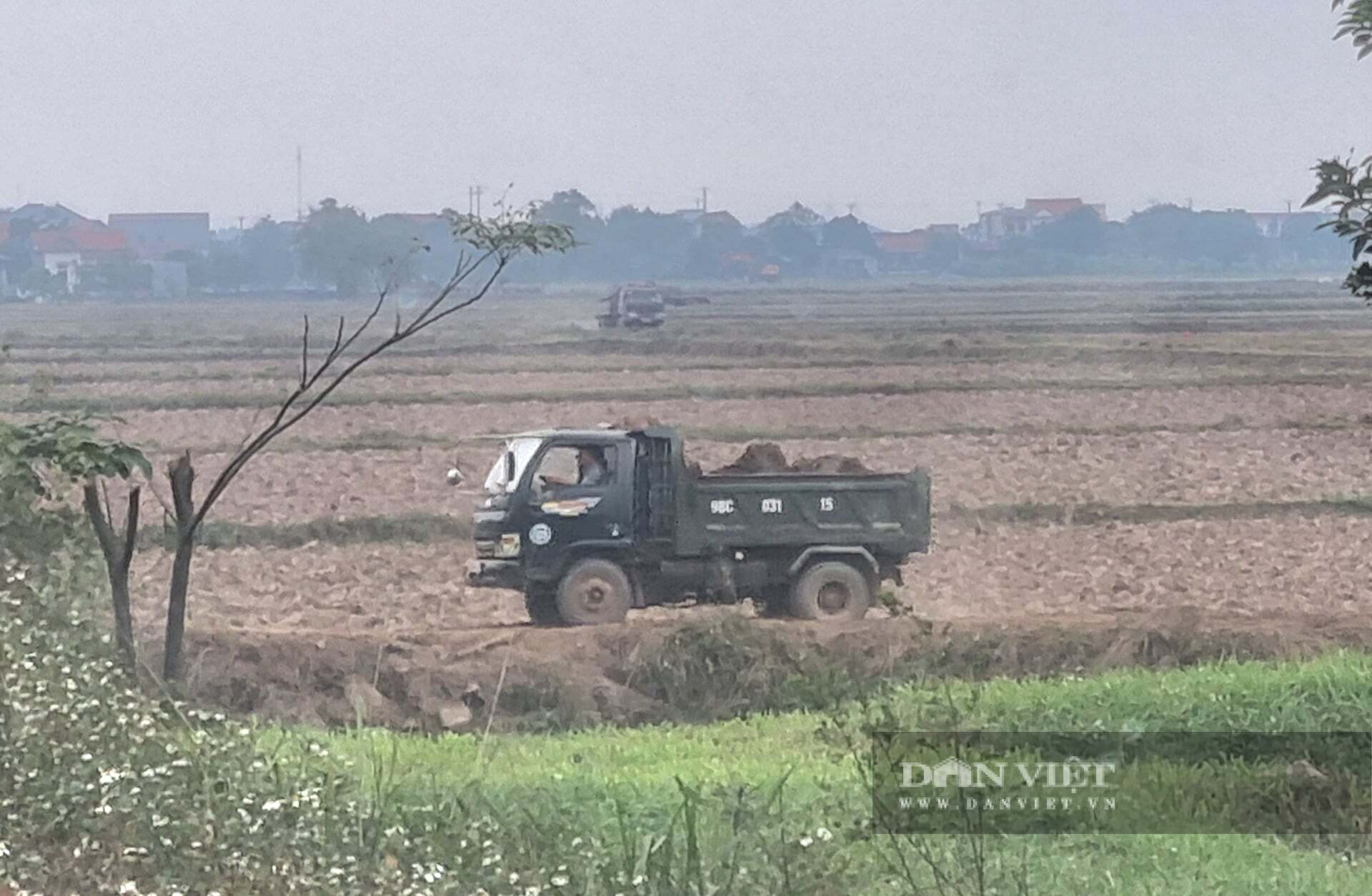 Cả một “binh đoàn” xe tải nối đuôi nhau chạy giữa cánh đồng, lấy đất rồi di chuyển lên bờ đê cách đó vài trăm mét để tập kết.