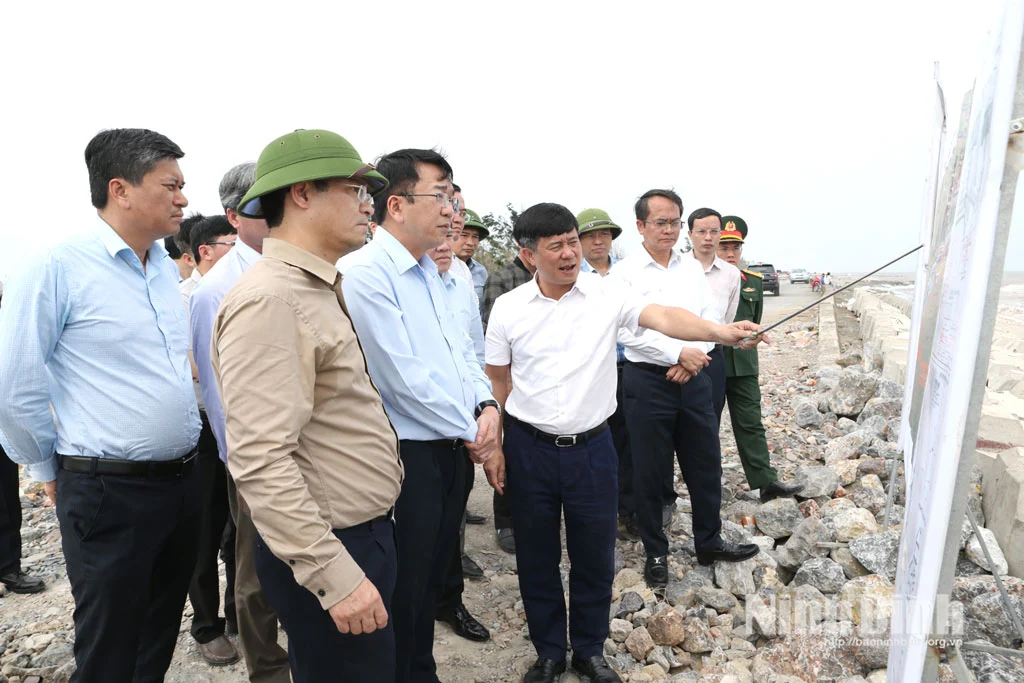 Đồng chí Chủ tịch UBND tỉnh Ninh Bình-Nguyễn Thanh Bình và Đoàn công tác kiểm tra tuyến đê, kè Hải Thịnh II, xã Hải Thinh (địa phận huyện Hải Hậu, tỉnh Nam Định trước đây).