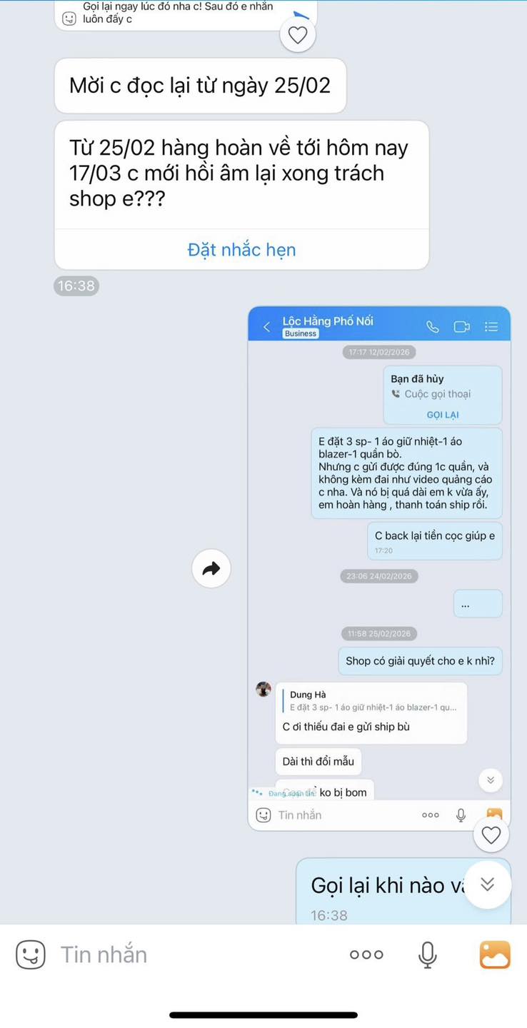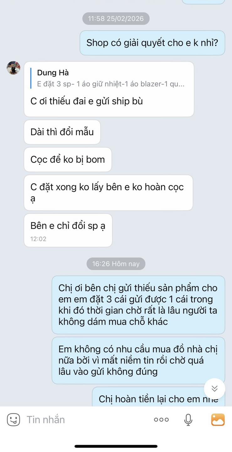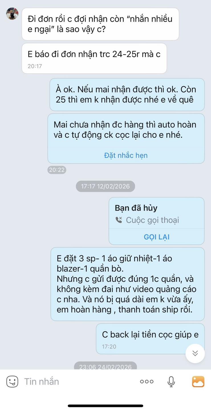 5. Sau Tết em liên hệ lại để xử lý đơn thì shop trả lời chậm. Khi trao đổi lại, em thấy sản phẩm không phù hợp (em cao 1m53, nặng 53kg nhưng quần dài 96–98cm), màu sắc cũng khác ảnh. Vì shop giao thiếu và không đúng nên em không muốn tiếp tục mua và yêu cầu hoàn tiền cọc nhưng shop không đồng ý.